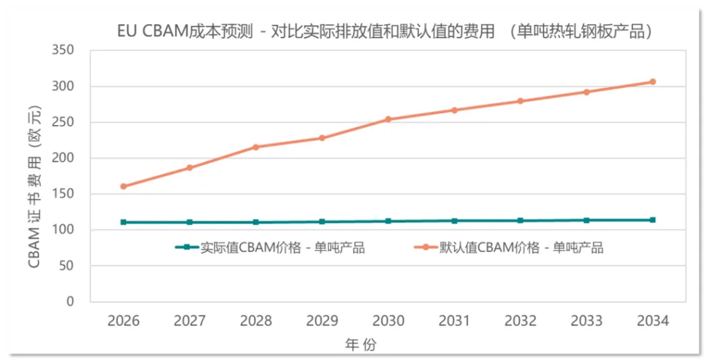 另外需要注意的是,该默认值还会逐年上涨。根据2025年12月17日发布的Annex to Implementing act on default values文件中显示,钢铁产品2026年的默认值基于2025年默认版本增加了10%,2027年增加20%,而2028年增加30%。这意味着中国生产的7208号工艺路线为BF-BOF热轧钢从2025年的每吨产品3.187t CO2e增长到2026年的3.506(即我们在上文中采用的数据),2027年会到3.824 ,2028年高达4.143。