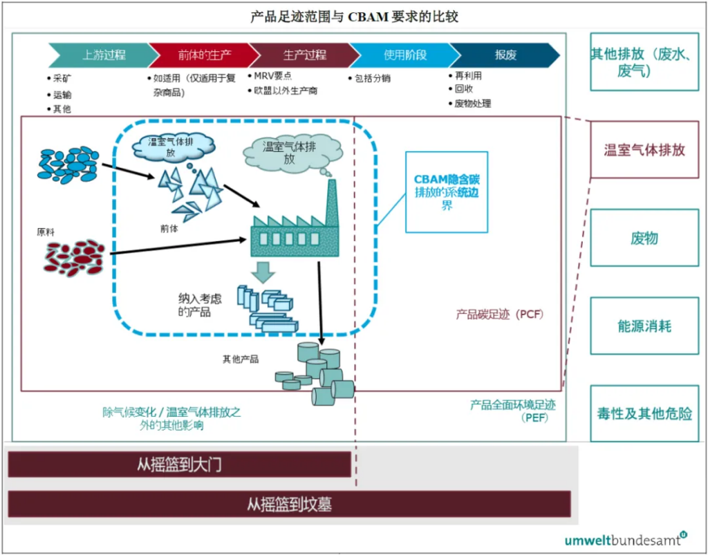 在核算中,CBAM 仅覆盖与欧盟进口产品相关的特定生产环节及其隐含碳排放,采用监管明确限定的边界;这与市场上更常提及的“碳足迹”的系统边界并不相同:碳足迹(如ISO 14067)通常覆盖产品从原材料获取到生产、使用及报废的全生命周期排放,系统边界可根据研究目的设定且更为全面,如下图所示: