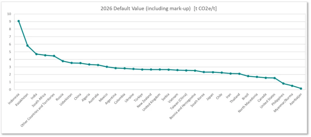 - 欧盟默认值(2026年热轧钢默认值):3.506 t CO₂ e/t,该值为生产自中国的CN编码为7208号、工艺路线为BF-BOF热轧钢的默认值,摘自欧盟2025年12月17日发布的Annex to Implementing act on default values文件,请注意该数值在这里仅作为对比示例