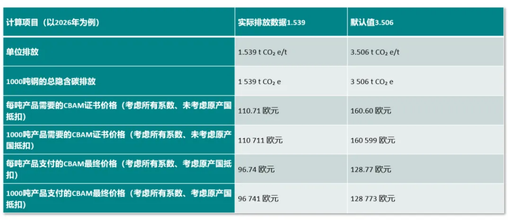 即进口到欧盟的1 000钢,对应的 1 539 吨CO2e,就是 CBAM法规认定的:“如果本批热轧钢板在欧盟生产,应当被 EU ETS 覆盖的排放量”。