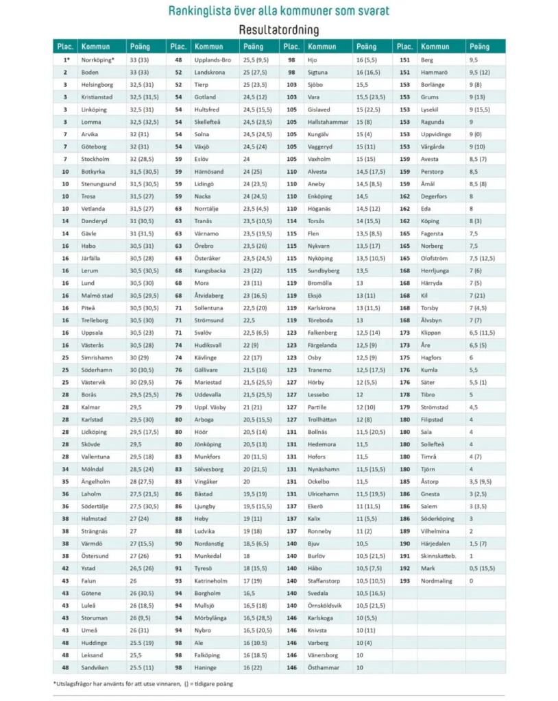 根据最新排名,位列第二名的城市为Boden,Helsingborg、Kristianstad、Linköping与Lomma并列第三。这些排名靠前的城市具备一个共同特点——它们已发布与气候适应相关的行政决议,并为相关工作分配了专门资源,展现出系统性和前瞻性的应对能力。